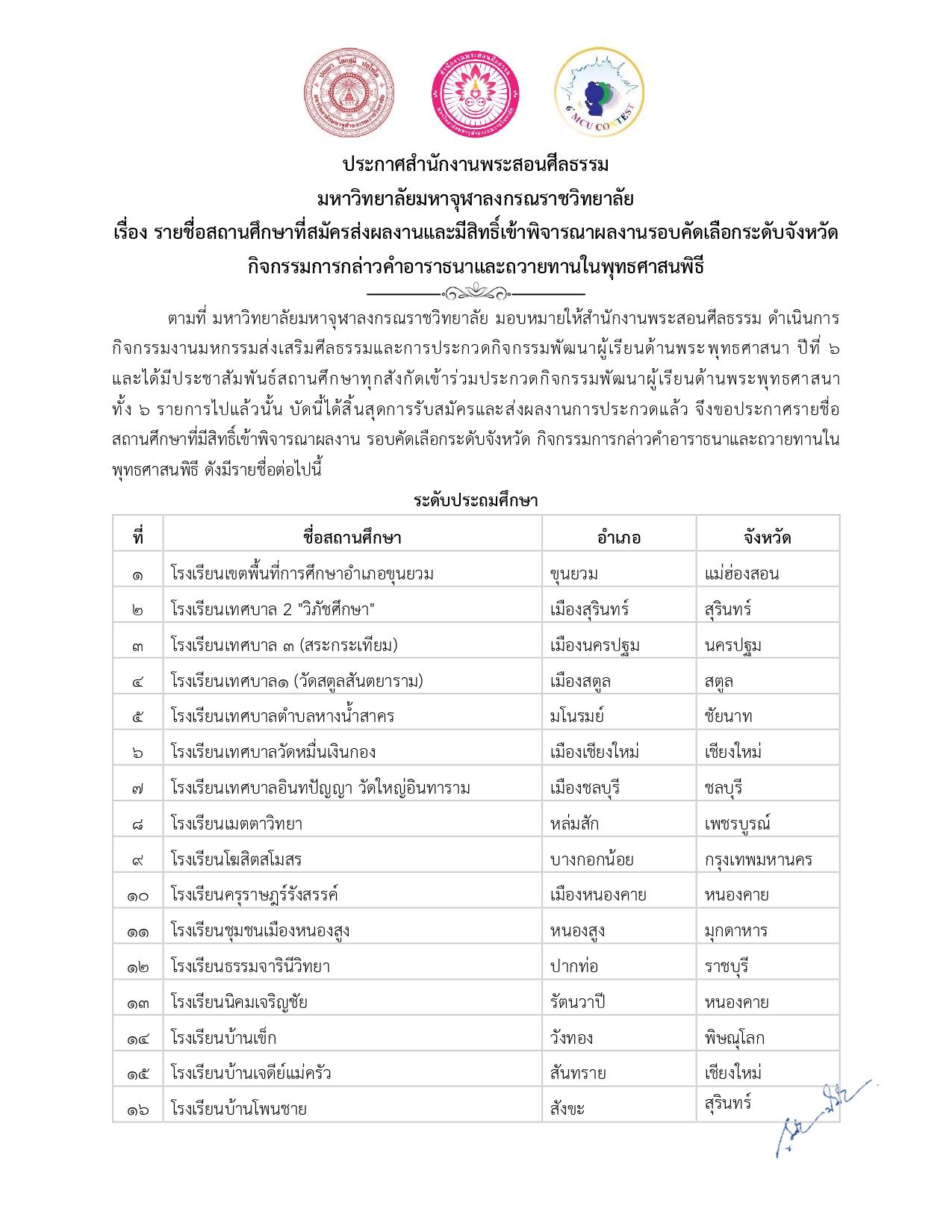 ตามที่ มหาวิทยาลัยมหาจุฬาลงกรณราชวิทยาลัย มอบหมายให้สำนักงานพระสอนศีลธรรม ดำเนินการกิจกรรมงานมหกรรมส่งเสริมศีลธรรมและการประกวดกิจกรรมพัฒนาผู้เรียนด้านพระพุทธศาสนา ปีที่ ๖ และได้มีประชาสัมพันธ์สถานศึกษาทุกสังกัดเข้าร่วมประกวดกิจกรรมพัฒนาผู้เรียนด้านพระพุทธศาสนา ทั้ง ๖ รายการไปแล้วนั้น บัดนี้ได้สิ้นสุดการรับสมัครและส่งผลงานการประกวดแล้ว จึงขอประกาศรายชื่อสถานศึกษาที่มีสิทธิ์เข้าพิจารณาผลงาน รอบแรก (คัดเลือกระดับจังหวัด) กิจกรรมการกล่าวคำอาราธนาและถวายทานในพุทธศาสนพิธี